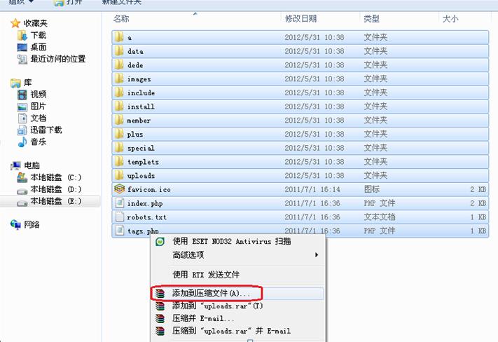 進入源代碼文件夾,將所有的文件和文件夾選中,選擇“添加到壓縮文件”。
